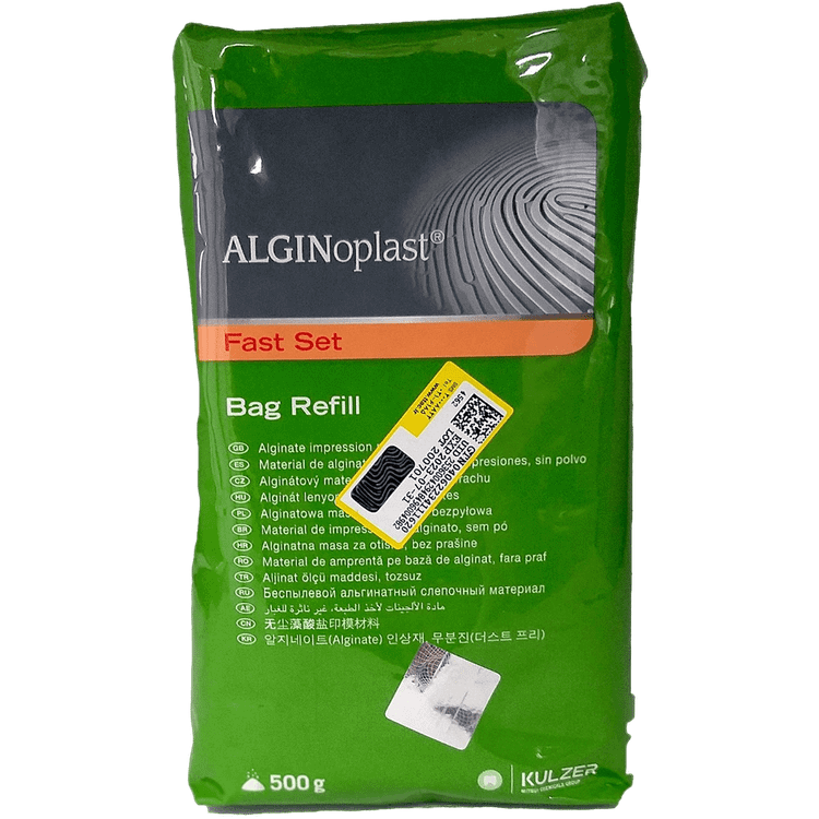 این پودر جهت قالب گیری دندان استفاده میشود و خیلی سریع سفت میشود، بعد از اتمام قالب گیری روی آن یک دستمال خیس قرار داده تا زمانی که می خواهد به دست کارگاه دندان سازی برسد.