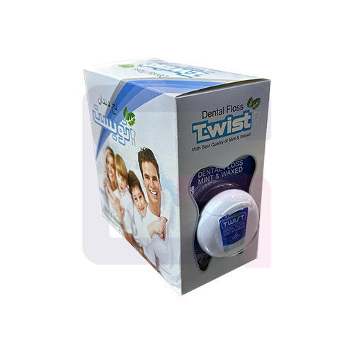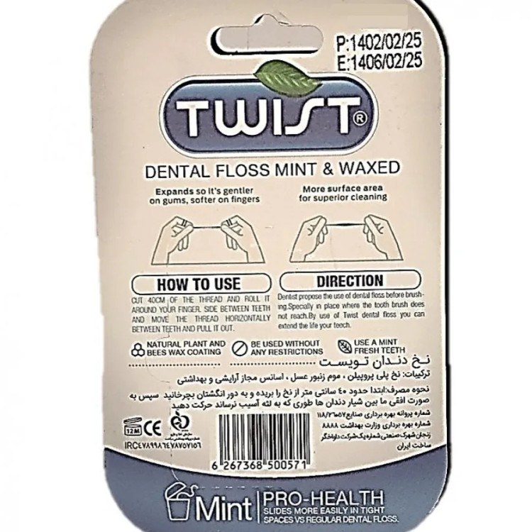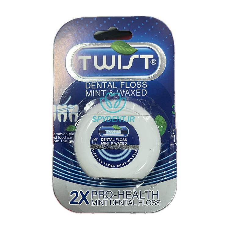نخ دندان تویست از محصولات پر متقاضی و پر طرفداری در دسته بندی نخ دندان می باشد که با اخذ سیب سلامت و رعایت کلیه موارد بهداشتی , در کنار حفظ کیفیت ساخت بالا , جایگاه بزرگی مابین محصولات مشابه پیدا کرده است . نخ دندان با اسانس نعنا و روکش موم برای حرکت راحت تر و روان بین دندان ها از بین بردن رسوبات مضرو جرم میان دندانها جلوگیری از ورم لثه و بوی نا مطبوع دهان خوش بو کردن دهان دارای تاییدیه سازمان غذا و دارو.