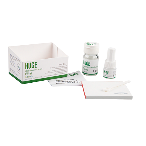 گلاس آینومر ترمیمی برند هیوج در بسته های 12 گرم مایع به همراه 15 گرم پودر عرضه می گردد.